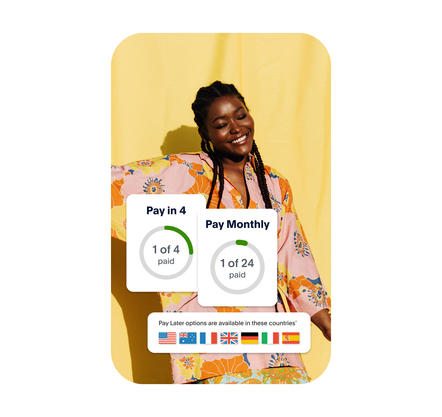*Pay Later is available in US, UK, DE, FR, IT, ES, AU. Product availability subject to local requirements. Merchant and consumer eligibility varies depending on status. Credit checks, fees and other requirements apply and vary depending on product and jurisdiction. See product-specific terms for details.