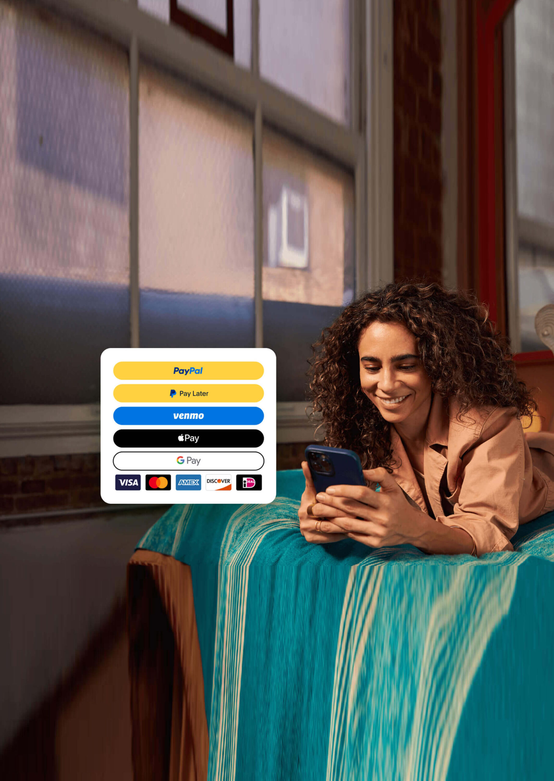 Help maximize your conversion by offering PayPal, Pay Later, Venmo (US), card processing, Apple Pay, Google Pay™, and country-specific payment methods.